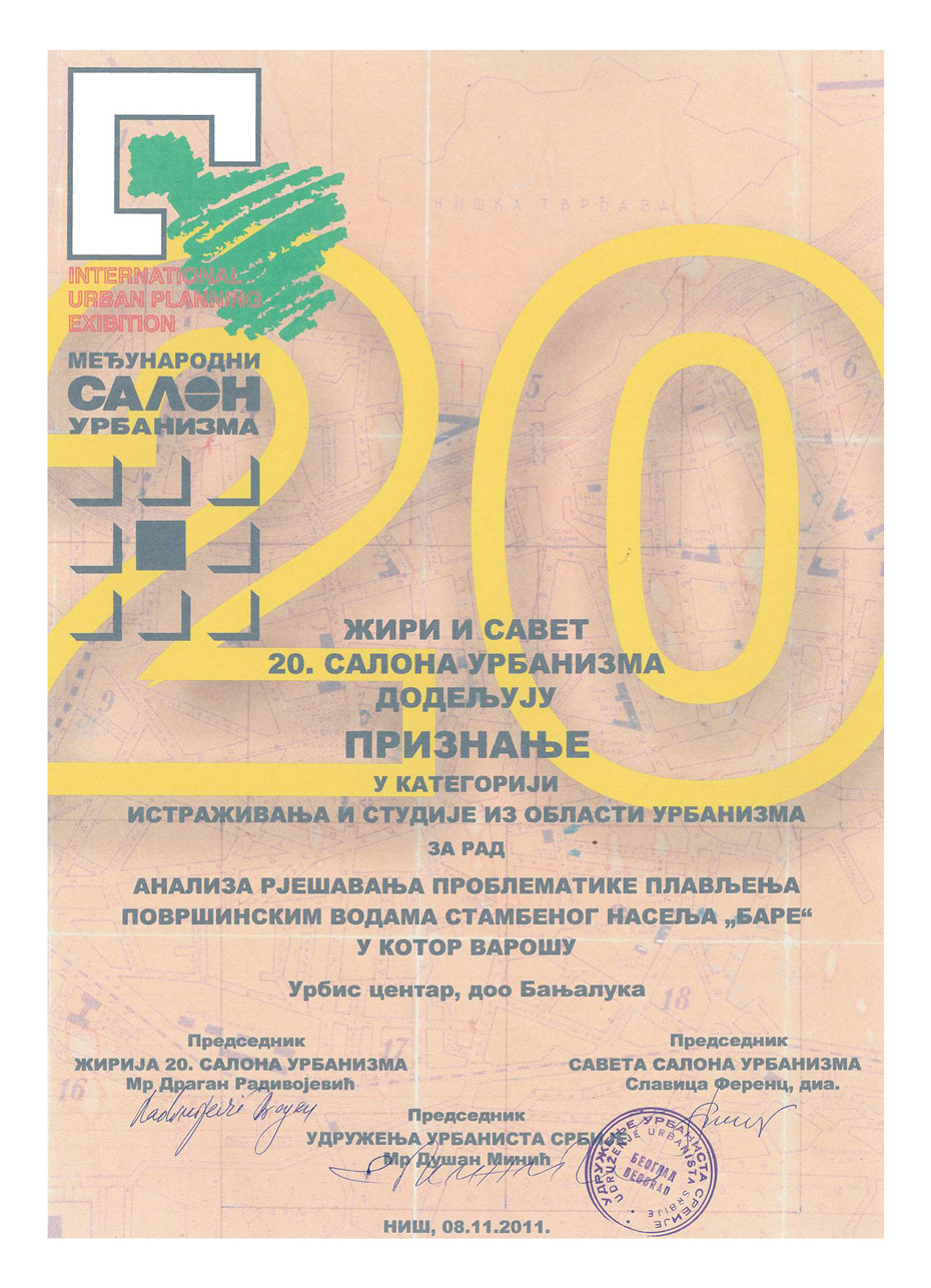 mr Risto Stjepanović, dipl.inž.građ. Priznanje 20. Salona urbanizma u kategoriji istraživanja i studije iz oblasti urbanizma za rad Analiza rješavanja problematike plavljenja površinskim vodama stambenog naselja „Bare“ u Kotor Varoši.