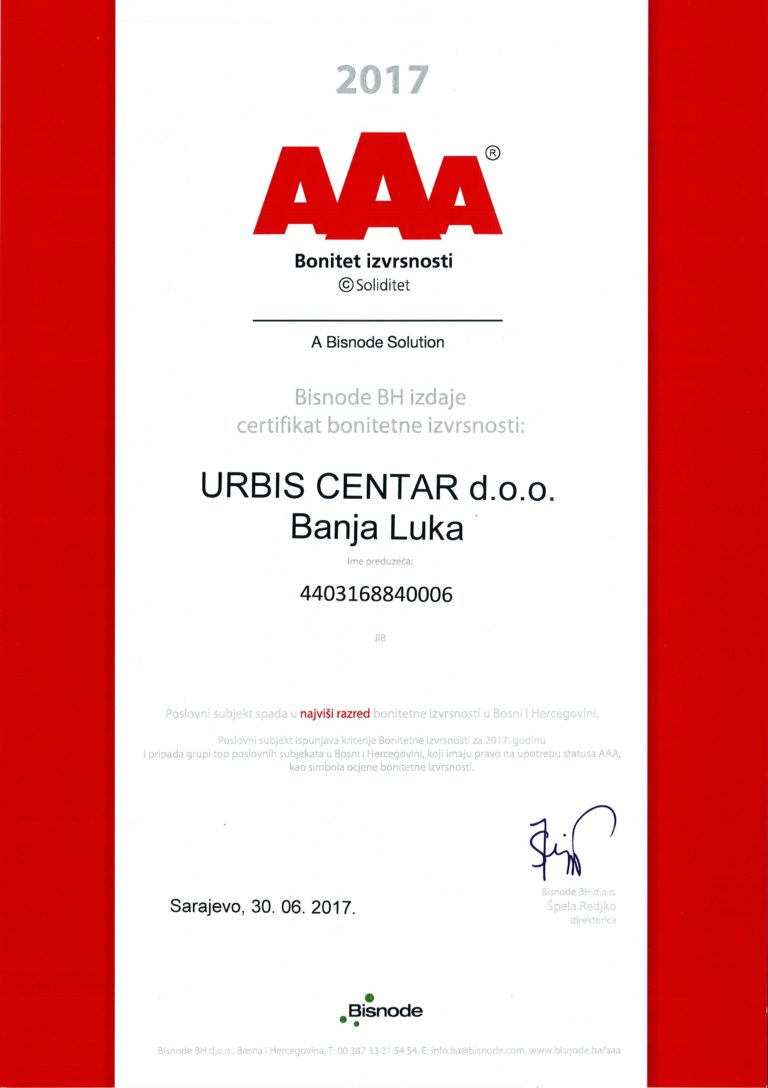 Bisnode BH izdaje certifikat bonitetne izvrsnosti 2017. god.